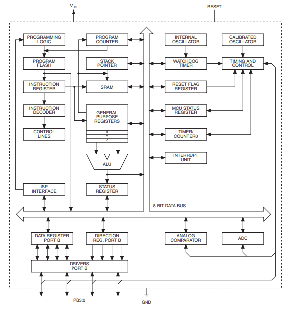 - ATtiny5/10 is also equipped with a four-channel, 8-bit Analog to Digital Converter (ADC).